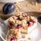 Spread the quark mixture on the crumble base. Add the plum pieces on top. Sprinkle the rest of the dough on top of the mixture.